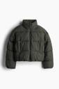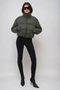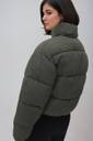 The image shows a woman wearing a Green puffer jacket. The jacket has a Stand collar and a front zipper closure. It features a cropped design with two side pockets that have zippers. The sleeves are long, and the jacket appears to be padded, providing warmth and comfort. She pairs it with black pants, completing a sleek, monochromatic outfit.