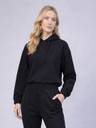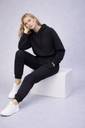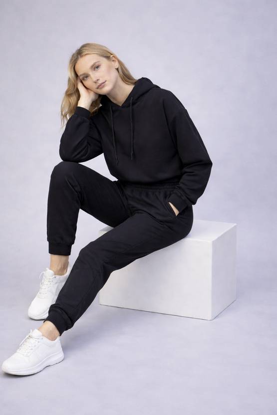 This black hooded co-ord set is crafted from a soft, comfortable cotton blend for everyday ease. The sweatshirt features a hooded neckline with adjustable drawstrings and full sleeves for a relaxed, cozy feel. Paired with matching bottoms designed with an elasticated waistband and side pockets, this set offers a clean, modern look. Ideal for casual wear, travel, or lounging in comfort.