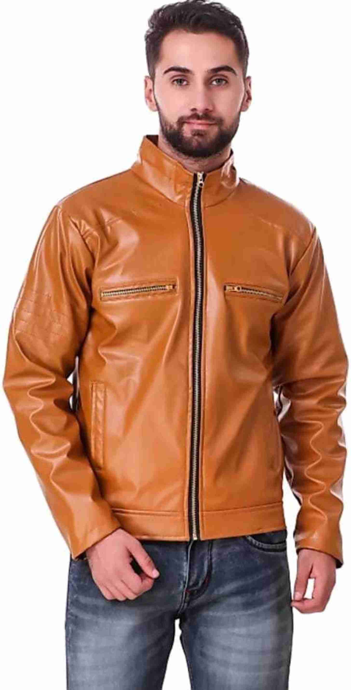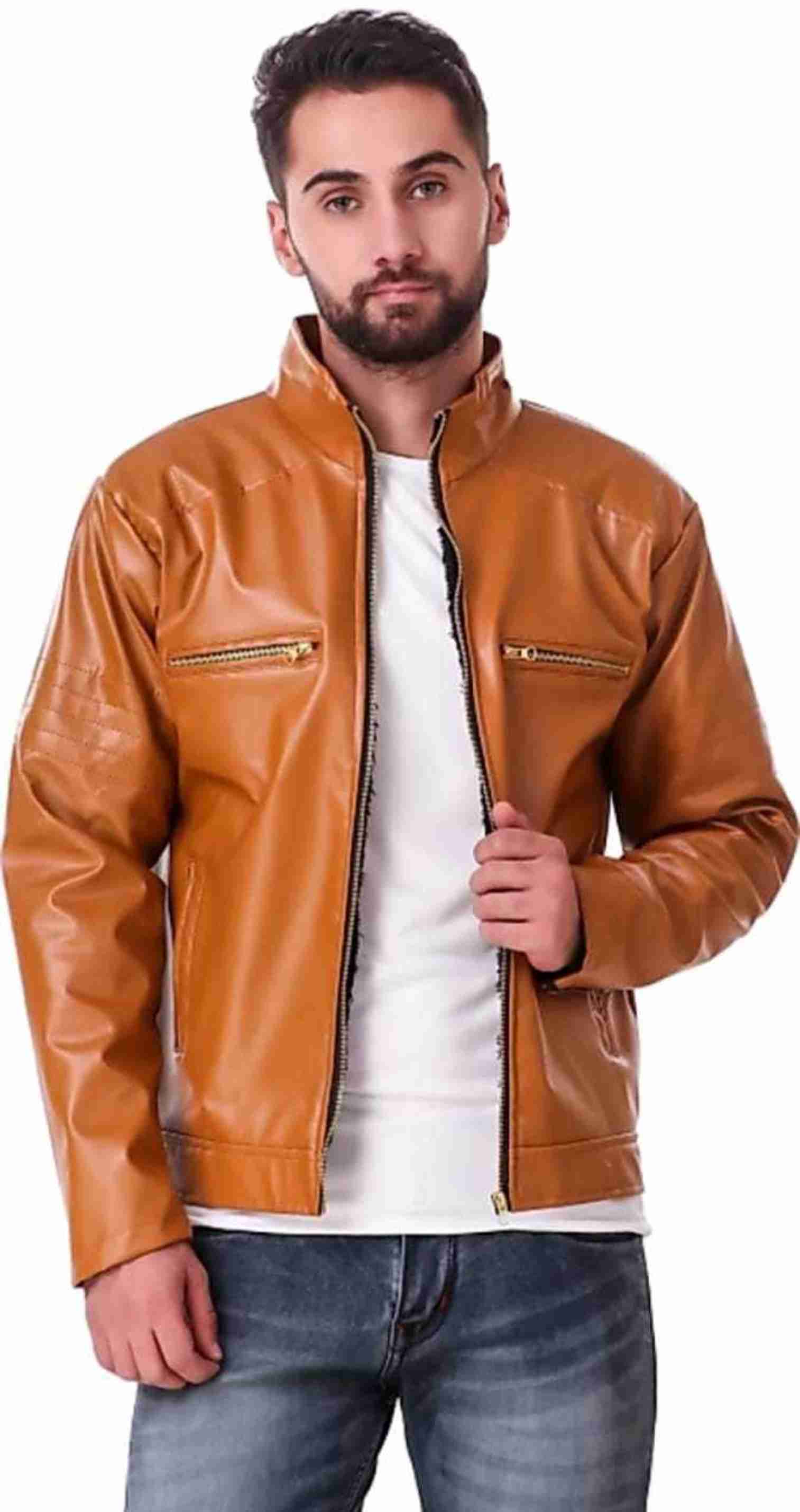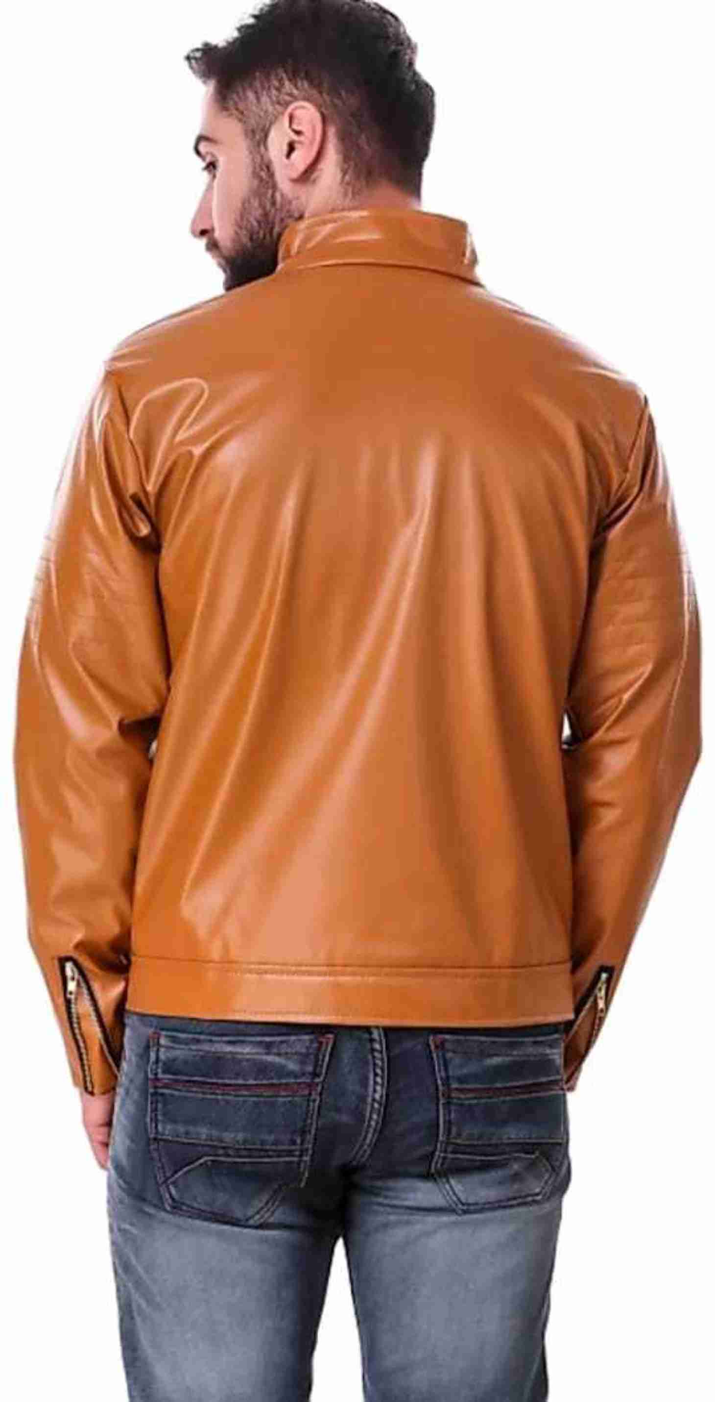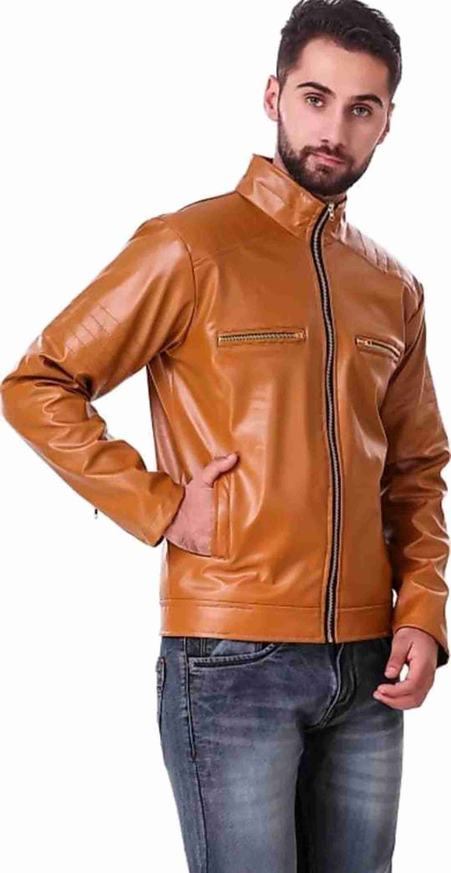 This stylish regular fit jacket in the display has full sleave and stand collar. Inside one pocket and branded zippers, this faux leather jacket is light in weight and will ensure cofort all time.