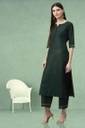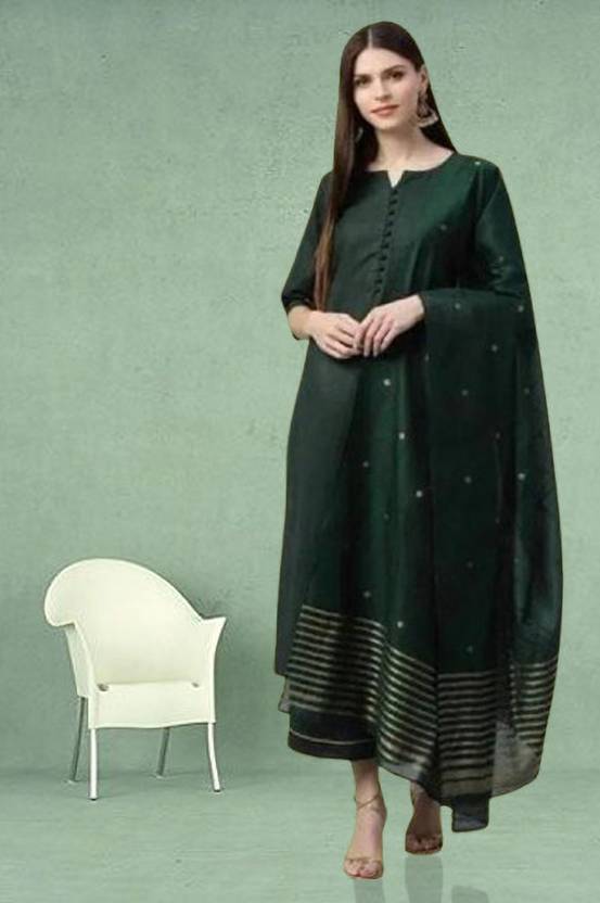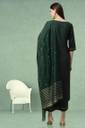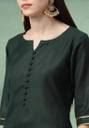 This elegant dark green ethnic kurti set is designed to bring a touch of sophistication to your festive and party wardrobe. Featuring a straight-cut calf-length kurti with 3/4th sleeves and button detailing on the neckline, it offers a graceful and flattering fit. The set comes with matching palazzo for added comfort and style. Completing the ensemble is a beautifully crafted dupatta with a striped woven border and subtle golden embellishments, enhancing its ethnic charm. Made from a reyon blend fabric, this outfit is perfect for weddings, festive occasions, and cultural gatherings, offering a perfect balance of comfort and traditional elegance.