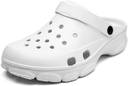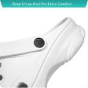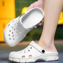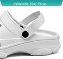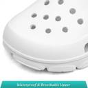 These white slide sandals are crafted from a waterproof and breathable material, ensuring comfort and quick drying. The upper features multiple ventilation holes for enhanced airflow, while the deep U-cup heel provides extra comfort and support. An adjustable heel strap allows for a secure and customizable fit. The robust, textured sole offers good grip and durability. Ideal for casual wear, these sandals are perfect for beach trips, poolside lounging, garden activities, or as comfortable indoor footwear. They complement casual outfits such as shorts, casual dresses, swimwear, and loungewear.