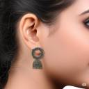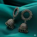 These exquisite jhumka earrings are a perfect blend of traditional Indian design and contemporary oxidized silver finish. The intricate craftsmanship features a circular stud with a detailed floral or sunburst pattern, from which a classic bell-shaped jhumka dangles. The bell is adorned with delicate vertical grooves and a textured band, adding to its charm. The antique, blackened finish of the silver gives them a rustic yet elegant appeal, making them a versatile accessory for both ethnic and fusion outfits. They are lightweight and comfortable for all-day wear, adding a touch of timeless sophistication to any look.