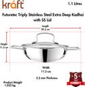Kraft Futuretec Triply Stainless Steel Extra Deep Kadhai 18 cm diameter with Lid 1.1 L capacity (Stainless Steel, Induction Bottom)