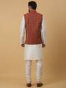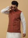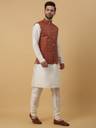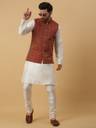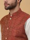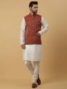 This Men's Jacquard Bandhani Silk Blend Sleeveless Green Nehru Jacket and Cream Kurta set is perfect for Festive occasions. The silk blend fabric gives a luxurious look and the mandarin collar adds a touch of elegance. The set includes a front pocket for convenience and a loop button closure for a secure fit. The churidar set completes the traditional look with its knee-length long sleeve design and side pockets. Elevate your style with this expertly crafted jacket set.