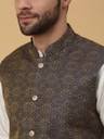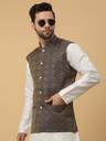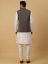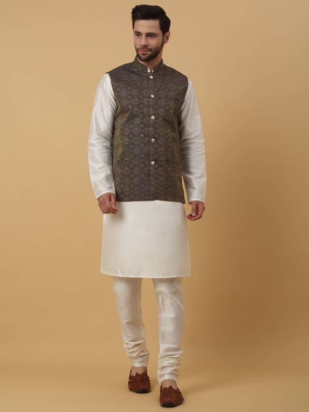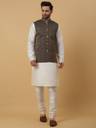 This Men's Jacquard Bandhani Silk Blend Sleeveless Green Nehru Jacket and Cream Kurta set is perfect for Festive occasions. The silk blend fabric gives a luxurious look and the mandarin collar adds a touch of elegance. The set includes a front pocket for convenience and a loop button closure for a secure fit. The churidar set completes the traditional look with its knee-length long sleeve design and side pockets. Elevate your style with this expertly crafted jacket set.