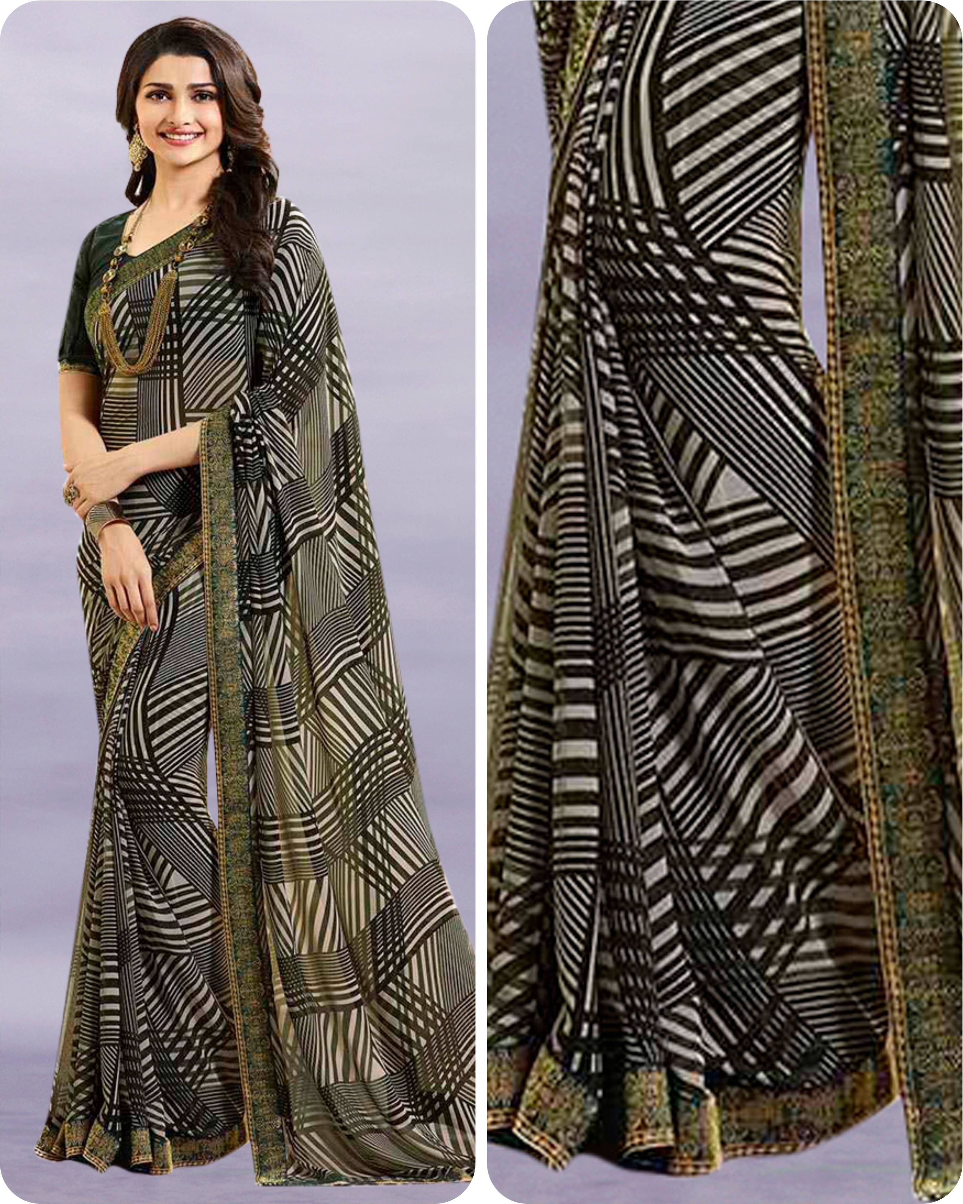 Heavy Printed Women's Chiffon laherita striped Saree Elegantly crafted to add ethnic grace to your wardrobe, this classy saree with a clever touch of class is meant for some very special occasions. The saree accentuates the beauty of Indian women of all ages and suits diverse occasions and tastes. Thereâ??s no other outfit more feminine than a saree; it is elegant as well as stylish. Pair this piece with heels or flats for a graceful lookComes with Blouse Piece The saree comes with a blouse piece which is similar to the shade of the saree. It is unstitched and can be altered according to your fit and style that you require. We present a variety of sarees like silk, crepe, Tusser silk, Net sarees, chiffon sarees etc, Wear this latest design saree with tradition, feminism, serenity; which gives fashionable, design traditional look. They are manufactured keeping all the ages and occasions in mind. They are traditional and ethnic, but they are youthful as well. Whether it is a party, festivals, or wedding, this saree will surely add extra â??Charmâ?? to your personality.