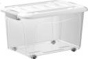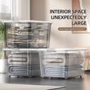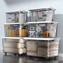 Transparent Design: Clear plastic construction allows for easy identification of contents without opening the bin., Secure Lid: White lid with grey latches ensures a tight seal to protect items from dust, moisture, and pests., Durable Material: Made from high-quality plastic for long-lasting use and durability., Versatile Storage: Ideal for storing a wide range of items including seasonal decorations, clothing, toys, and office supplies., Easy to Carry: Built-in handles on the lid make it easy to transport the bin from one place to another., Stackable: Designed to be stackable, allowing for efficient use of space in storage areas.