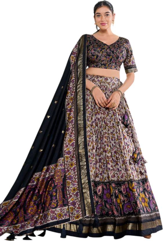 Lehenga Fabric : Tusser Silk, Lehenga work : Floral Print With Foil Work, Lehenga Waist : SUPPORTED UP TO 44, Lehnga Stitching : Stitched With Canvas Belt, Flair : 3 Meter, Blouse Work : Floral Print With Foil Work, Dupatta Work : Floral Print WithFoil Work And Gotta Patti Lace Border Also Comes With Tassels