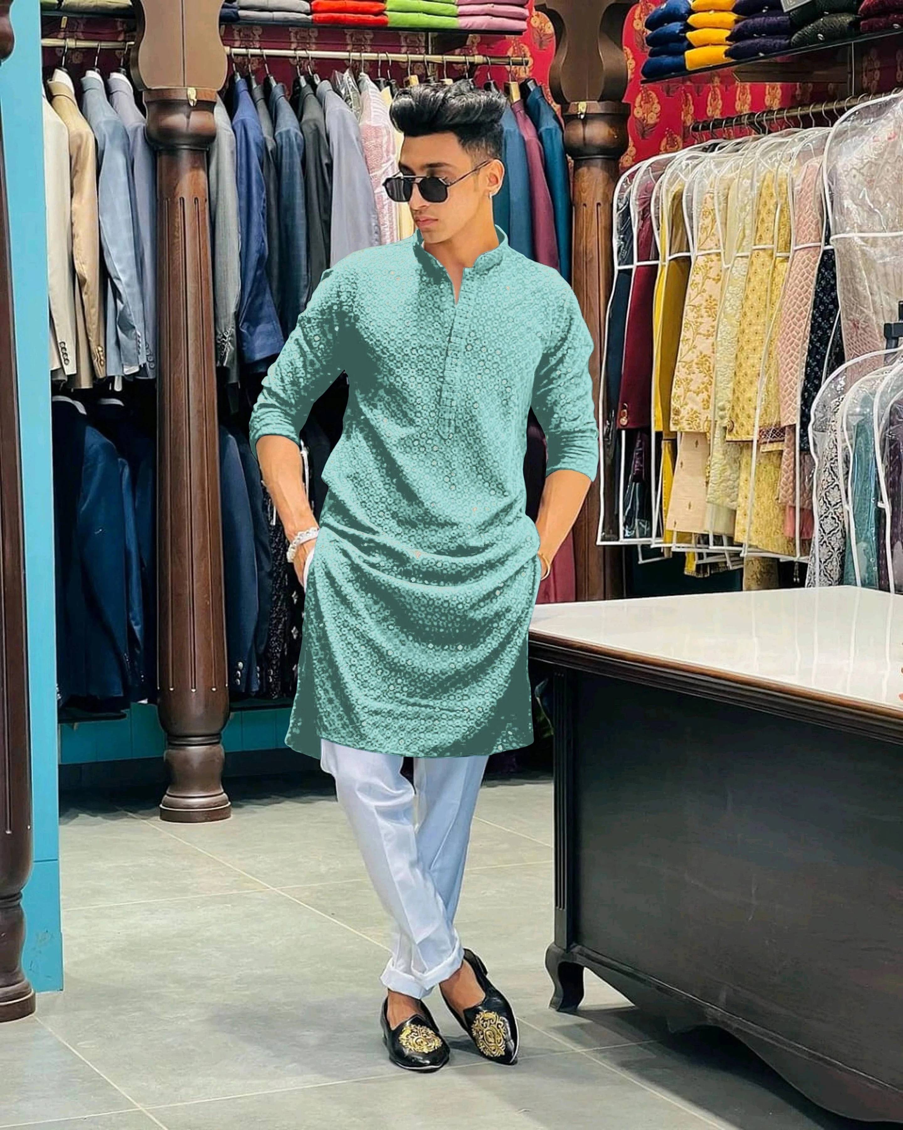 Lucknowi kurta set for men with mirror work and premium fabric for wearing at wedding festival and function any wear and any season look like traditional wearing.