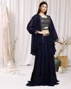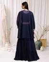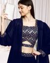 Elevate your ethnic wardrobe with this elegant navy blue Indo-Western set. It comes with a beautifully embroidered crop top, a flowy solid skirt, and a long shrug with embroidered sleeve detailing. Perfect for festive occasions, weddings, and parties, this outfit combines traditional charm with a contemporary twist.