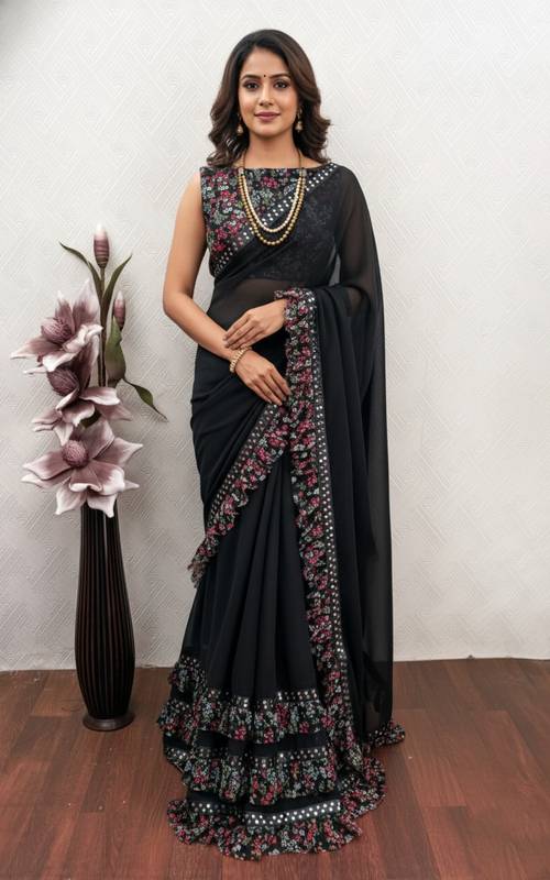 Krish Creation Self Design Bollywood Georgette Saree (Black)