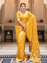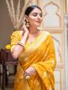 Banarasi's_4099_Yellow_The art silk and jacquard fabric of this saree lends an air of opulent beauty to your ensemble. It combines the strength of synthetic fibres with the shine of silk to provide comfort without losing elegance. The jacquard fabric gives it a distinctive touch. The fabric produces a wonderful silhouette that enhances your complete look. With its delicate shine and silky texture, art silk lends a classy touch to the saree.,This gorgeous saree features an alluring combination of motifs inspired by nature. The body features blocks with elaborate leaves and floral, and elegant peacock designs. The border is just as charming, with layers decorated with delicate flower and foliage designs entwined with the classic elegance of peacocks. This harmonic arrangement of design components reflects the beauty of nature in all of its minute details.
