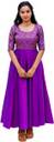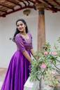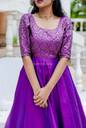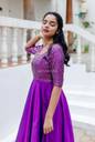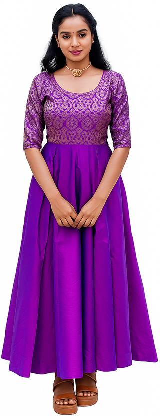 The upper part of the dress features a fitted bodice with intricate embroidery or jacquard-style pattern in a slightly darker or contrasting purple hue. It has a scoop neckline and elbow-length sleeves, giving it a traditional yet elegant look.