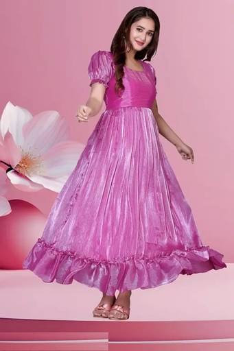 The skirt flares out from the waist into a full-length, flowy Anarkali-style gown. It appears to be made from rich silk or satin fabric, giving it a luxurious shine and graceful drape.
