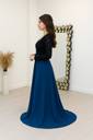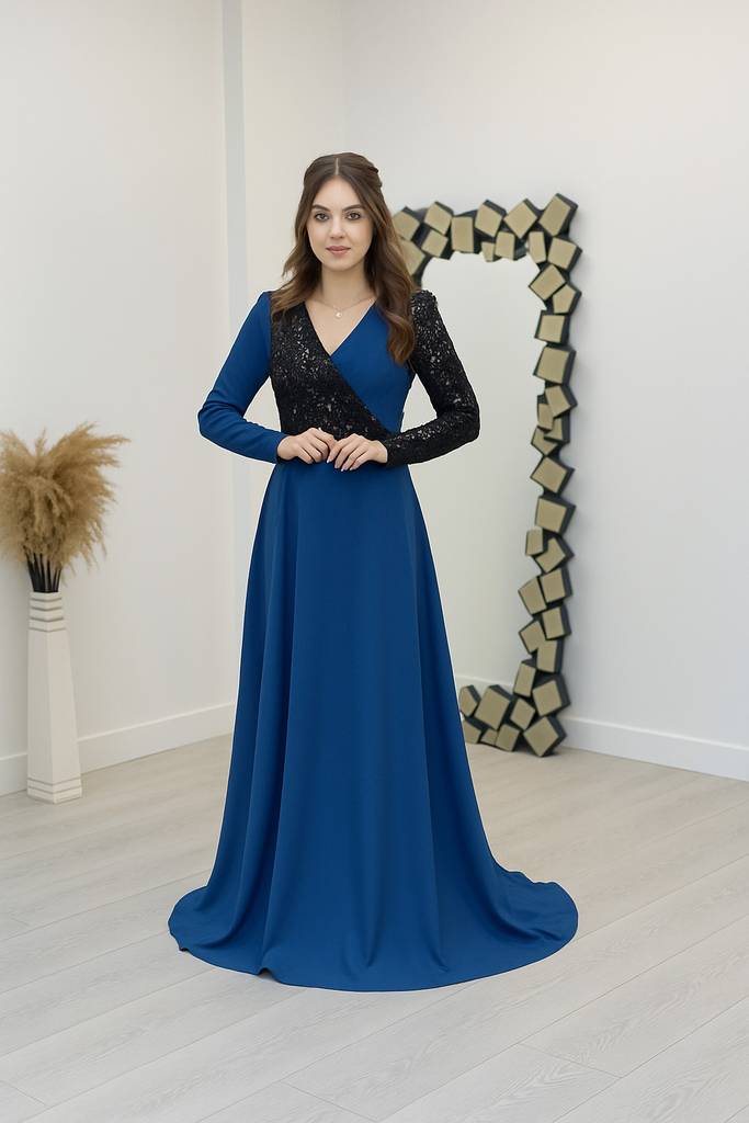 The gown is floor-length with a flared silhouette, exuding grace and sophistication. The bodice features a wrap design with black sequins, adding a touch of sparkle. The V-neckline complements the long sleeves, which are also adorned with sequins.