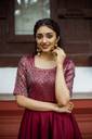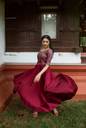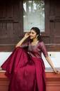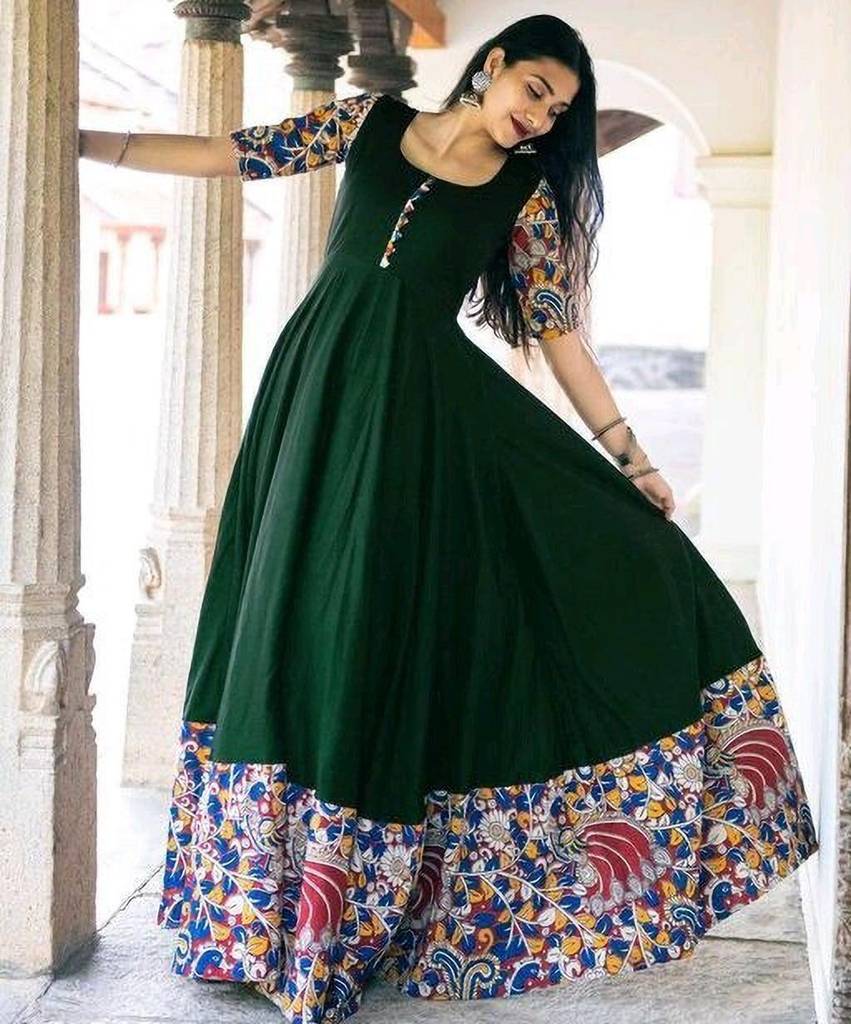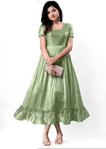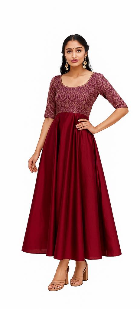 The skirt flares out from the waist into a full-length, flowy Anarkali-style gown. It appears to be made from rich silk or satin fabric, giving it a luxurious shine and graceful drape.
