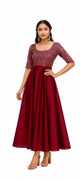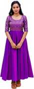 The upper part of the dress features a fitted bodice with intricate embroidery or jacquard-style pattern in a slightly darker or contrasting purple hue. It has a scoop neckline and elbow-length sleeves, giving it a traditional yet elegant look.