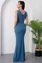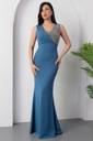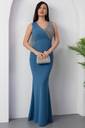 This is a stunning floor-length royal blue evening gown designed with a sleek, fitted silhouette that gently flares out at the hem, creating an elegant mermaid-style effect. The gown features a sleeveless, asymmetrical V-neckline, where one side is crafted from the same blue fabric and the other is adorned with shimmering silver sequin embellishments, adding a touch of glamour and sophistication.