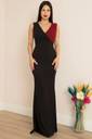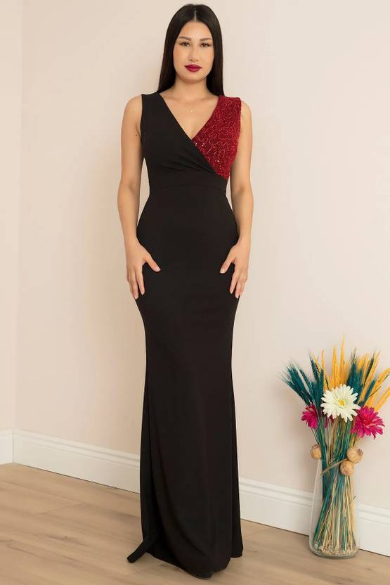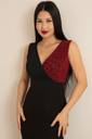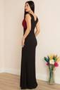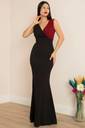 The waistline is fitted, accentuating the wearer’s figure and giving a structured, polished look. The dress is styled minimally, allowing the eye-catching neckline and the rich color to be the focal points. The model complements the look with a silver clutch and silver hoop earrings, enhancing the overall formal and refined aesthetic.
