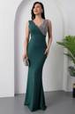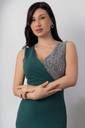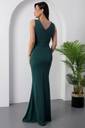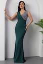 The waistline is fitted, accentuating the wearer’s figure and giving a structured, polished look. The dress is styled minimally, allowing the eye-catching neckline and the rich color to be the focal points. The model complements the look with a silver clutch and silver hoop earrings, enhancing the overall formal and refined aesthetic.