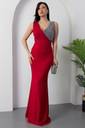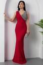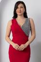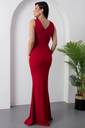 The waistline is fitted, accentuating the wearer’s figure and giving a structured, polished look. The dress is styled minimally, allowing the eye-catching neckline and the rich color to be the focal points. The model complements the look with a silver clutch and silver hoop earrings, enhancing the overall formal and refined aesthetic.