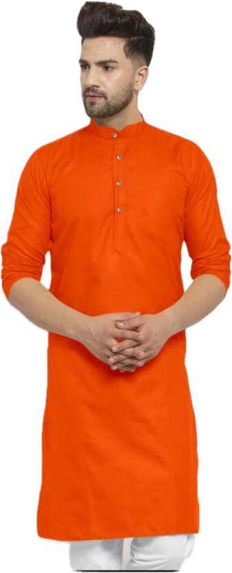 Men Solid Cotton Blend A-line Kurta (Orange)