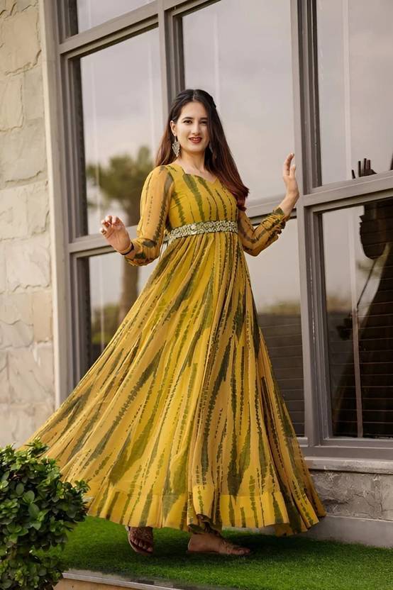 Boasting a printed pattern and crafted in the classic anarkali style, this women's gown exudes elegance and sophistication. Thanks to its anarkali design, this dress offers a flattering silhouette that accentuates your curves while providing a graceful flow. The printed pattern adds a touch of charm and uniqueness to your ensemble, making it a standout choice for any occasion.