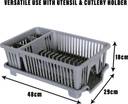 PACKAGE CONTAIN : 1 Piece Drying Basket with Tray | MATERIAL : Plastic | PACKAGE DIMENSION : 48 cm x 29 cm x 18 cm,VERSATILE USE WITH UTENSIL & CUTLERY HOLDER : The Versatile Use with a utensil and cutlery holder dish drainer makes kitchen organization a breeze. This innovative and functional kitchen accessory not only provides a convenient space to dry dishes but also includes specialized compartments to hold utensils and cutlery securely. Say goodbye to messy countertops and embrace the efficiency and convenience of the versatile utensil and cutlery holder dish drainer in your daily kitchen routine.,BPA-FREE & SPACE-SAVING SOLUTION : The BPA-Free and space-saving solution is a game-changer for health-conscious and eco-friendly individuals seeking a practical and efficient approach to storage.