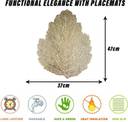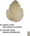 PACKAGE CONTAIN : 6 Piece Placemat set | Pack of 1 | Patta-Shape | MATERIAL : Leather | PACKAGE DIMENSION : 47 cm x 37 cm x 1 cm,USEFUL MATS FOR HOME & KITCHEN : In The Kitchen, Placemats shield your table or countertop from hot pots, pans, and dishes, preventing any potential damage. They act as a barrier against spills and stains, making post-meal clean-up a breeze. Additionally, placemats add a decorative touch to your dining space, allowing you to personalize your setting and match your d�cor. When it comes to the dining area, placemats play a pivotal role in presenting a well-arranged table setting.,ELEVATE YOUR DINING EXPERIENCE : Elevate Your Dining experience with our exclusive placemat set, meticulously designed to bring a new level of sophistication to your table. Each placemat is a work of art, featuring intricate patterns and designs that add flair and personality to your dining setup. Whether it's a casual family meal or a special gathering, these placemats provide a touch of elegance that complements any occasion.,VERSATILE USE & HEAT RESISTANT : These Mats are Engineered to handle high temperatures, making them the ideal choice for kitchen countertops and dining tables. Whether you're placing a steaming pot or a sizzling pan, our mats provide a reliable barrier, protecting your surfaces from heat damage. Beyond the kitchen, these mats find versatile applications throughout your home.Practical, resilient, and adaptable, our heat-resistant mats are a must-have for every household.,FUNCTIONAL ELEGANCE WITH PLACEMATS : The elegant designs and meticulously chosen patterns effortlessly elevate the aesthetics of your dining area, setting the stage for a delightful dining experience. But it's not just about looks; our placemats offer functionality too. Crafted from high-quality materials, they protect your table from spills, stains, and heat, ensuring its longevity. The easy-to-clean nature of these placemats means you can maintain their elegance with minimal effort.