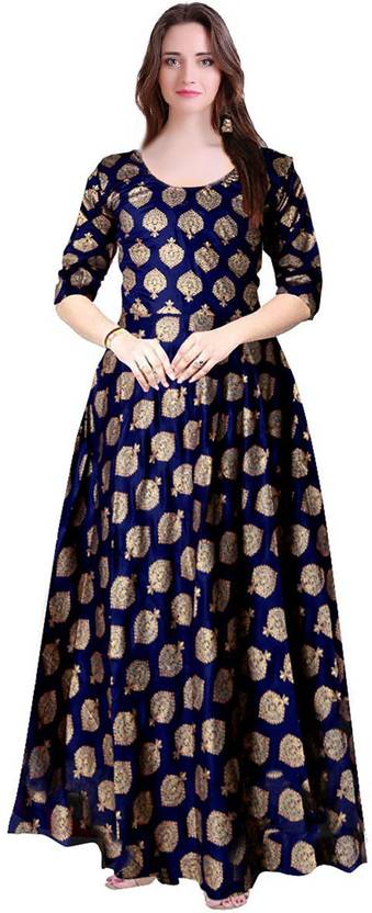 Printed Rayon Blend Semi Stitched Flared/A-line Gown (Blue)
