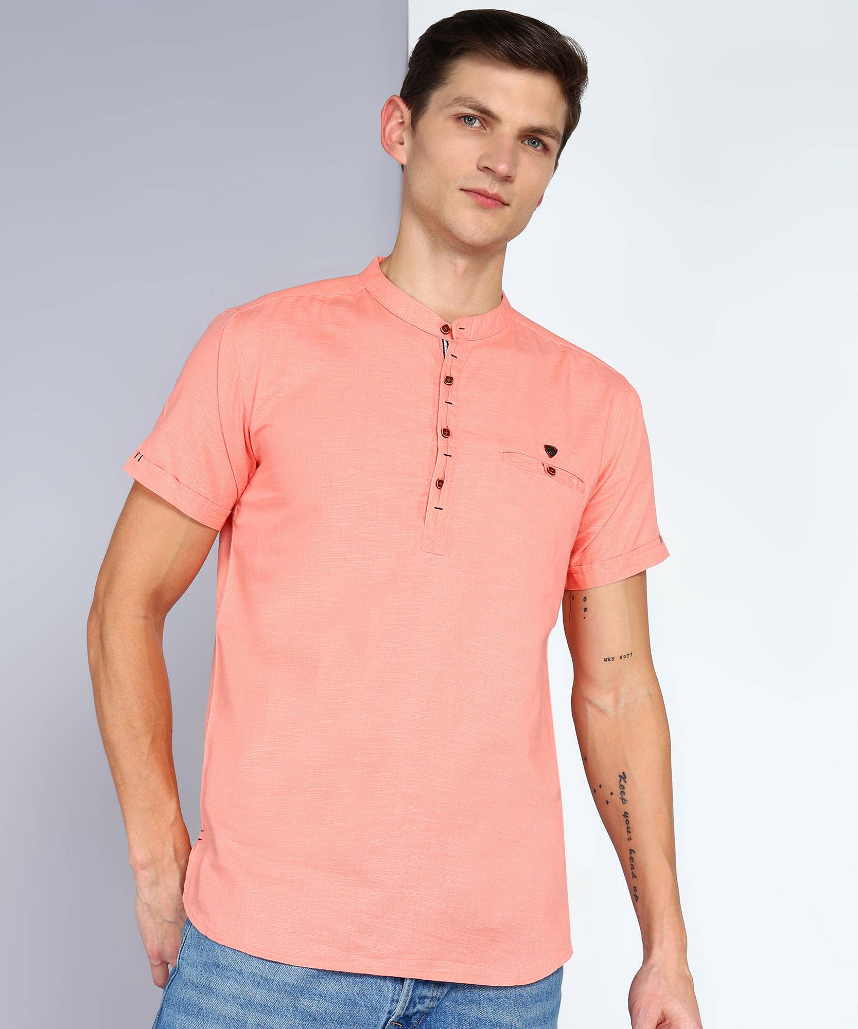 This Linen Cotton Kurta by Kuons Avenue is a must have style for your wardrobe. This Casual Kurta, has a Mandarin Collar, Half Sleeves, Bone Pocket on Chest, Curved Hemline. Complete the look by pairing it with the stylish pair of jeans or chinos when going for a casual date or just for your daily use.