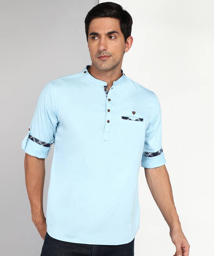 This Cotton Short Kurta by Kuons Avenue is a must have style for your wardrobe. This Casual Kurta, has a Mandarin Collar, Full Sleeves with Roll up Pattern, Welt Pocket on Chest, Curved Hemline. Complete the look by pairing it with the stylish pair of jeans or chinos when going for a casual date or just for your daily use.