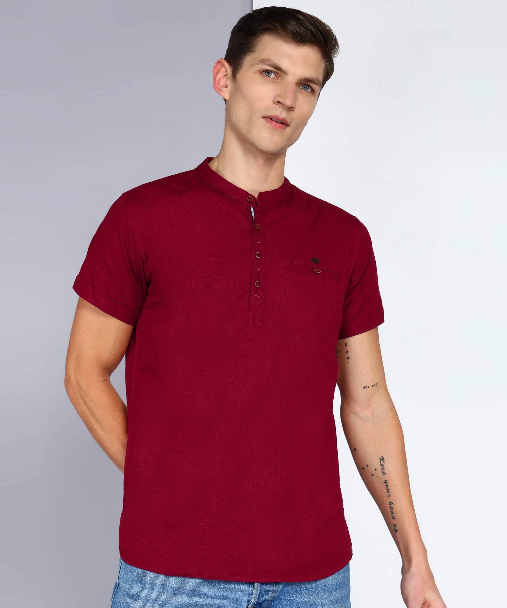 This Linen Cotton Kurta by Kuons Avenue is a must have style for your wardrobe. This Casual Kurta, has a Mandarin Collar, Half Sleeves, Bone Pocket on Chest, Curved Hemline. Complete the look by pairing it with the stylish pair of jeans or chinos when going for a casual date or just for your daily use.