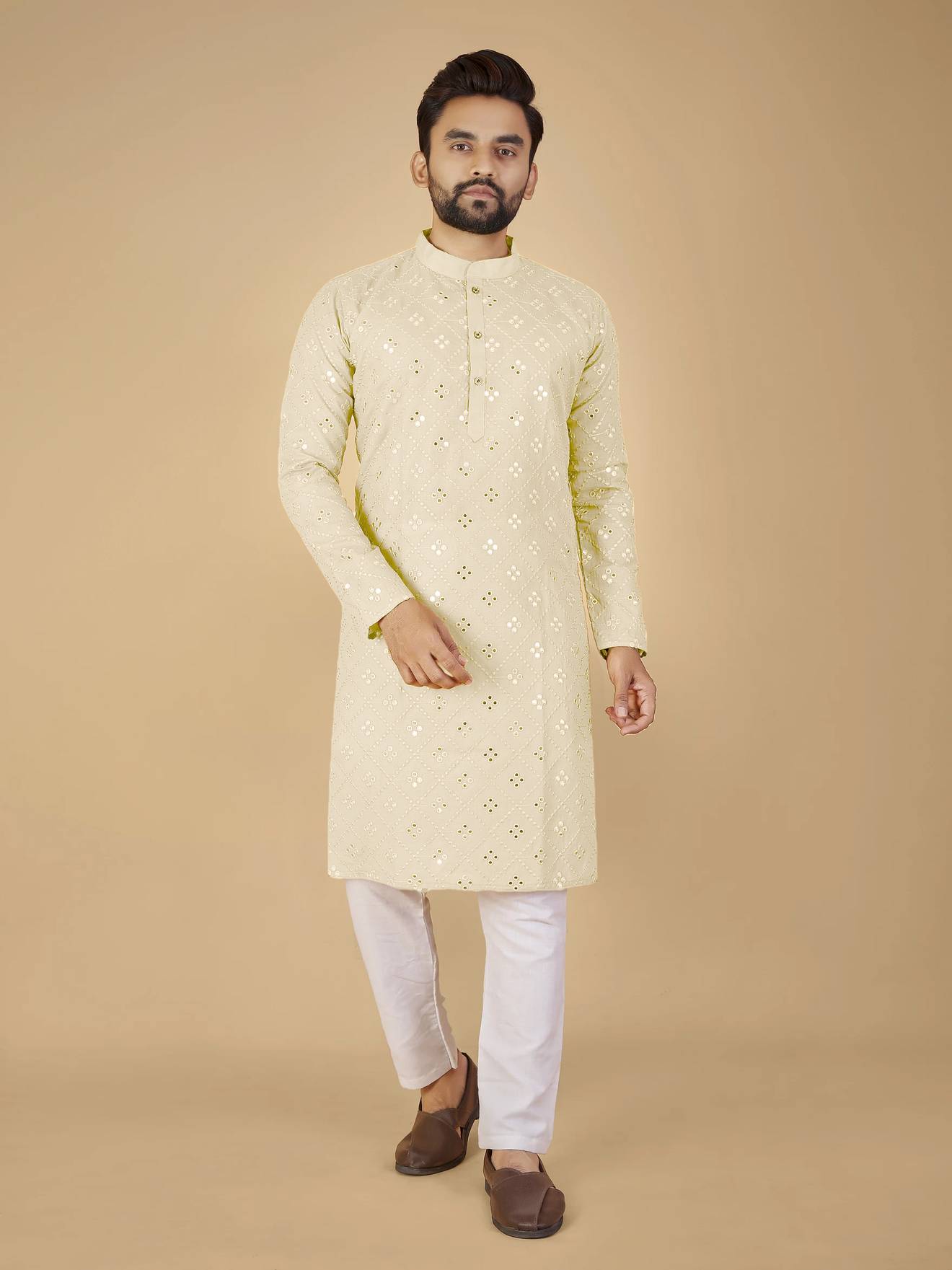 Kurta for men is made from cotton rayon fabric and Lucknowi work on it with Sequins perfect for wedding and party or festive wearing kurta for men
