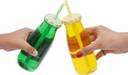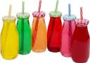 Set of 6, Lid and Straw Color: Blue, Green, Yellow, Red, Material: Glass Bottle