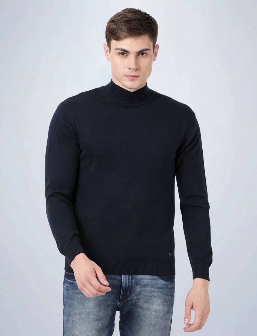 This is a classic men's high-neck sweater in a solid navy blue color. It features a smooth, fine knit texture, long sleeves with ribbed cuffs, and a ribbed hem for a comfortable and snug fit. The high neck provides extra warmth and a stylish look. The sweater appears to be a fitted style, making it versatile for various occasions. It can be paired with jeans, chinos, or trousers for a smart casual or semi-formal outfit.