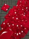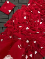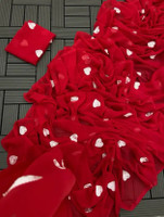 The body of the saree is covered with embroidered motifs in the shape of small hearts made with zari threads. These motifs are carefully placed across the fabric to maintain balance and consistency in design. When you drape the saree, these embroidered hearts give a soft decorative touch to the overall look. The threadwork adds texture without causing discomfort while wearing or folding.