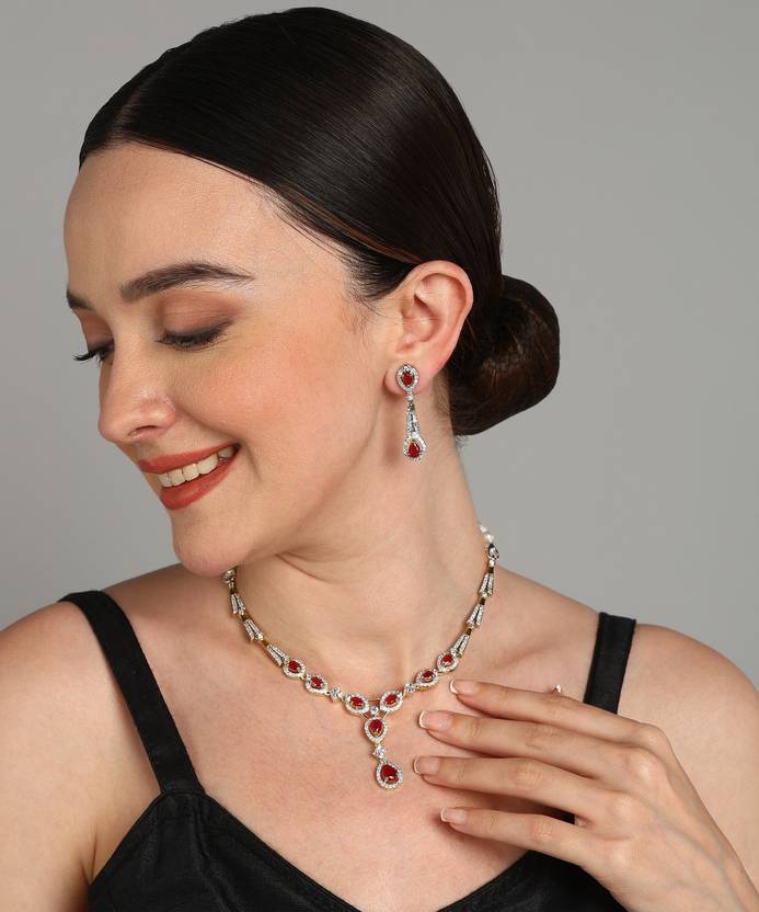 NK8 Gold Plated Red & White American DiamondAD Studded Designer Necklace Set