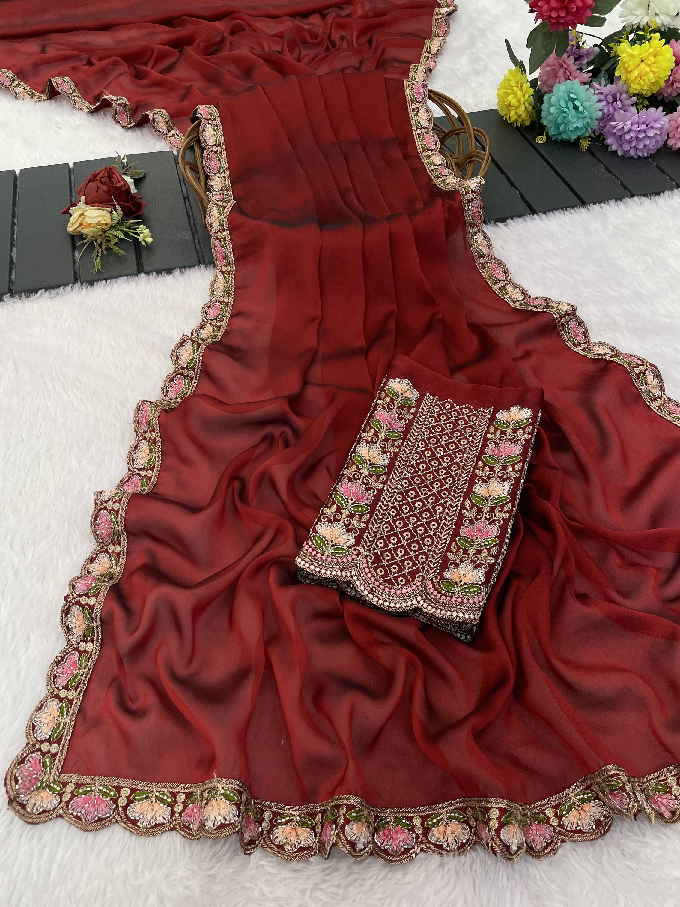 Solid/Plain, Embroidered Bollywood Silk Blend Saree (Maroon)