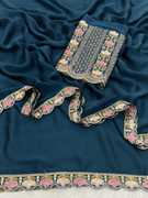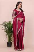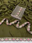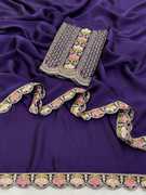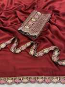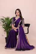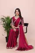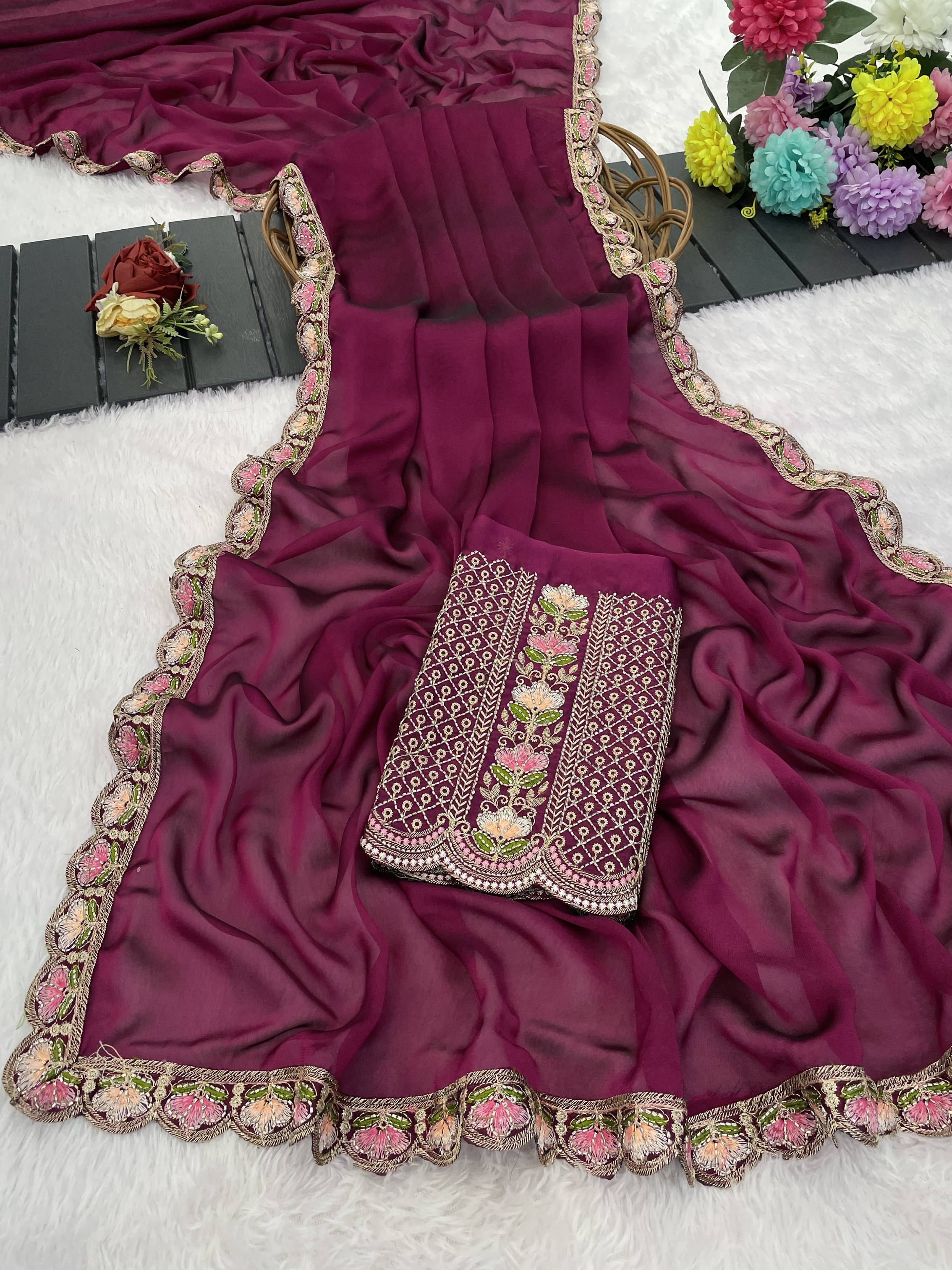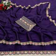 Make a bold style statement with this luxurious Falsa colored saree. Crafted from flowy, premium Silk fabric, this saree offers a graceful drape that is perfect for special occasions. The saree features a trendy scalloped cut-work border adorned with delicate floral embroidery in contrasting pastel pink and peach threads. It is paired with a stunning, heavy-work unstitched blouse piece that features a rich geometric lattice (jali) pattern and a central floral vine, ensuring you look elegant from every angle. Ideal for weddings, receptions, and festive celebrations.