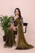 This rich shade pairs beautifully with antique gold or diamond jewelry. Since the blouse has heavy work, opt for a choker necklace and stud earrings to keep the look balanced. Style your hair in a chic low bun or soft waves to show off the blouse embroidery. A pair of strappy gold heels and a metallic clutch will complete this Bollywood-inspired look.