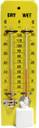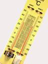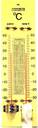 Two thermometers mounted on rigid wooden base, Red indicator shows temperature in degrees Celsius and Fahrenheit, Chart is included