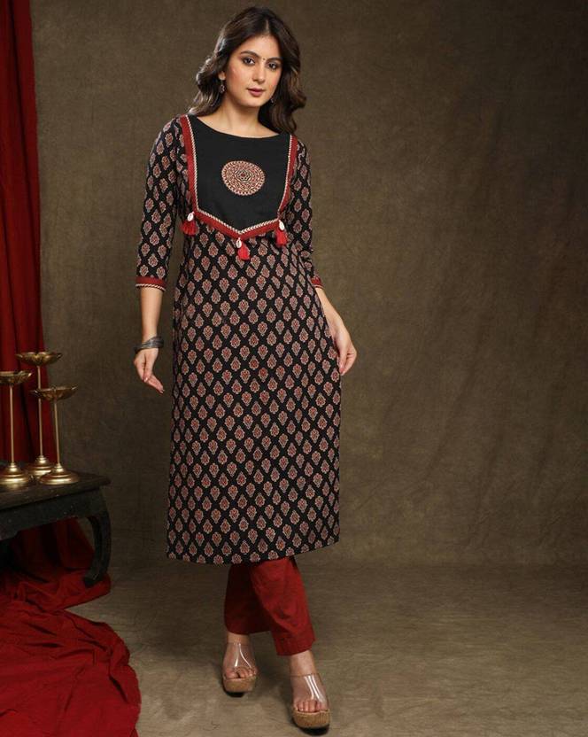 This black printed kurti for women blends comfort with ethnic charm, making it perfect for both daily wear and festive occasions. Made from soft fabric, it features a beautiful traditional print and a stylish embroidered yoke with tassel detail that adds a trendy touch to your look.