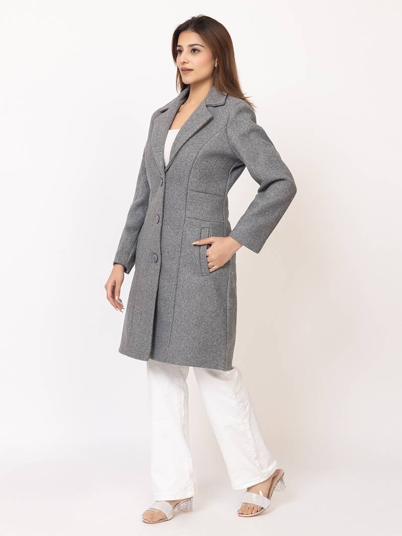 Stay effortlessly stylish this winter with this elegant grey long coat. Tailored from a premium suede fabric, it offers a perfect balance of warmth, comfort, and sophistication. The structured fit and minimalist design make it a versatile addition to your wardrobe — ideal for both office wear and casual outings.Pair it with white trousers or dark jeans and heeled boots for a chic, winter-ready look.