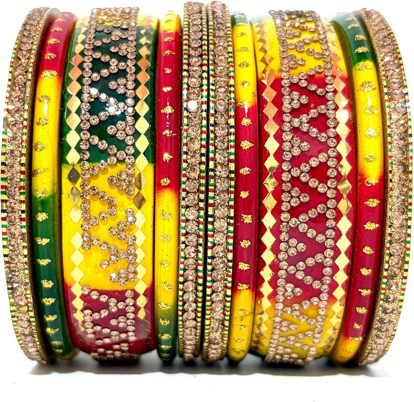 Bring charm to your traditional look with this stunning set of 10 multi-colour bangles. Crafted with care and a glossy finish, they pair beautifully with sarees, suits, and lehengas. Whether it’s a wedding or a festive evening, let your hands do the talking! Celebrate tradition with style. This elegant set of 10 multi-coloured bangles is designed to match the beauty of every Indian outfit. Lightweight, stylish, and timeless – just like you.
