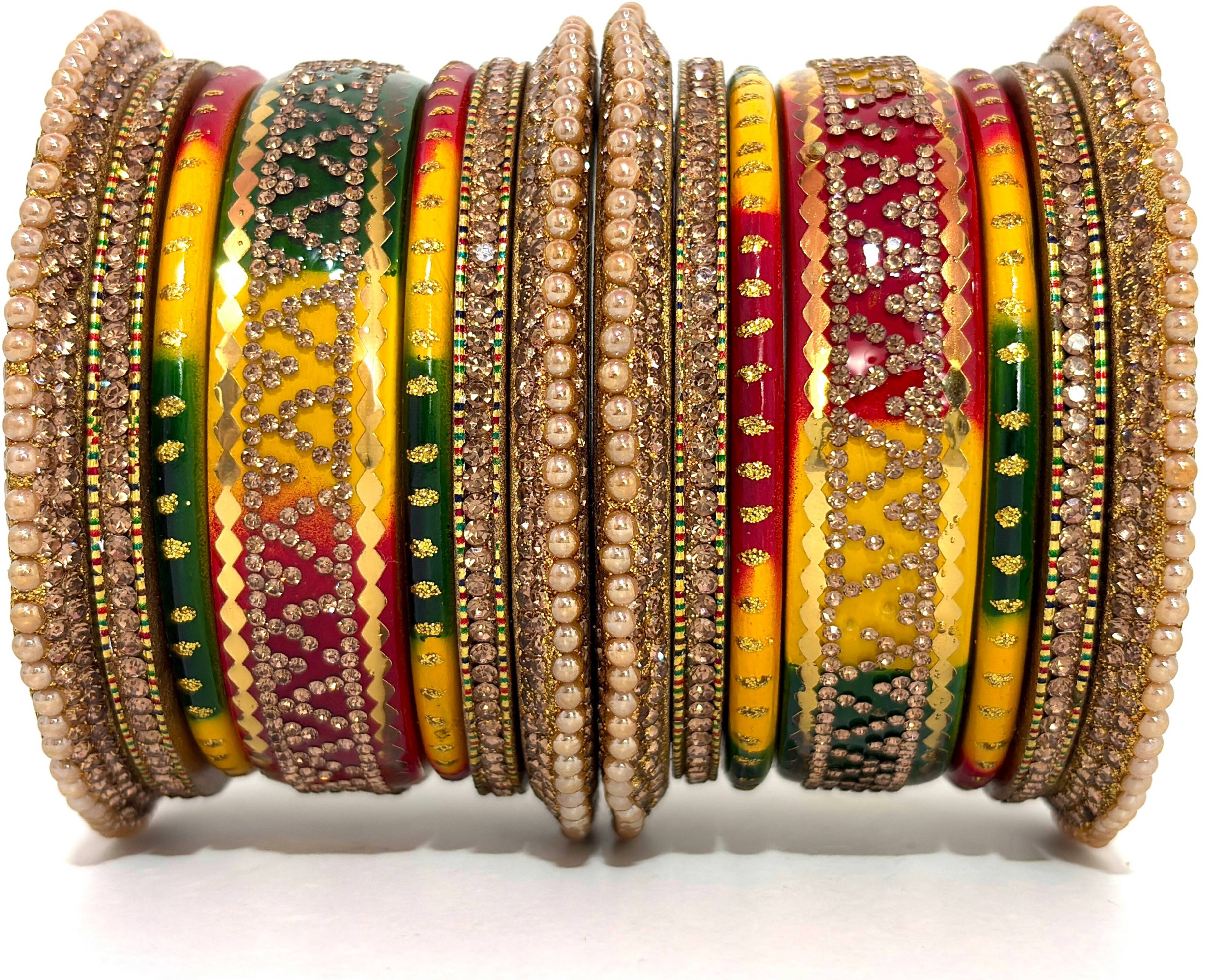 Bring charm to your traditional look with this stunning set of 14 Multi -color bangles. Crafted with care and a glossy finish, they pair beautifully with sarees, suits, and lehengas. Whether it’s a wedding or a festive evening, let your hands do the talking! Celebrate tradition with style. This elegant set of 14 Multi -colored bangles is designed to match the beauty of every Indian outfit. Lightweight, stylish, and timeless – just like you.