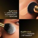 Use the flat top with the square end to apply primer, foundation, as well as skincare products with ease! Short strokes will help achieve a smoother finish. Flip it and use the fluffy end to add finishing touches and set your makeup. Ideally pair the flat end with liquid and cream products and use the fluffy end with powder formats.
