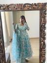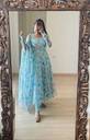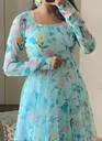 Indulge in timeless grace with this stunning sky-blue floral Anarkali gown, crafted from premium georgette fabric. The soft, flowy silhouette is adorned with delicate watercolor-style floral prints in pastel hues, lending it a dreamy and ethereal charm.