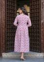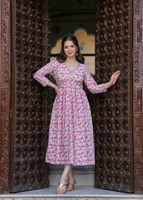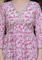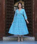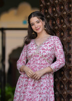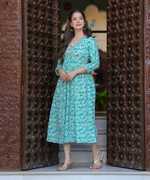 Sporting an Anarkali cut, this kurta offers a flattering and comfortable fit. Moreover, it creates an elongating effect, enhancing the wearer’s elegance. The V-neck adds a hint of sophistication, while the three-quarter sleeves balance tradition and modernity. The pleated flare ensures effortless movement, making it ideal for both casual gatherings and daytime outings.