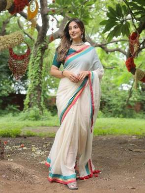The saree appears to be made of a soft cotton or cotton-silk blend, which drapes beautifully and offers comfort — ideal for festive occasions, traditional events, or elegant day wear.